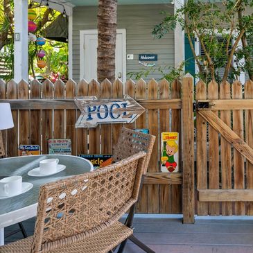 Just behind the Ivy Cottage is the Two Bedroom Conch Cottage with two queen bedrooms, an open-layout kitchen and living area, and quaint front porch. Enjoy the shared swimming pool and this home's fantastic Old Town location.
